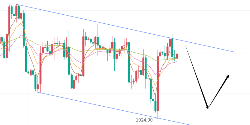 现在的关键是短期探底反弹是否具有延续性的强势放量。在这种情况下,短期空头无法反击,意味着在经历了两个阶段的震荡选择后,短期多头有望崛起并夺取主导地位。要实现这一点,关键是需要价格重新站稳在1975以上并逐步上涨。如果能够做到这一点,就有可能乘胜追击并继续上涨。