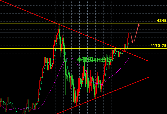 11.29 黄金月线收官出现小插曲,直至晚间才恢复正常上涨力度,盘尾最高触及4227一线,日线收饱满阳线,向上突破三角收敛区间,下周继续看多头延续力度,次高点在4245一线,如继续突破将再次冲击新高,4H周期中,慢牛震荡后测试中轨连阳收高,目前顶开布林上轨,也是强势单边上涨的表现,那么方向明确,下周操作上回踩低多看涨为主,支撑关注4170、4193,压力关注4245-50,同时也要谨防触及压力后扫盘力度出现。
