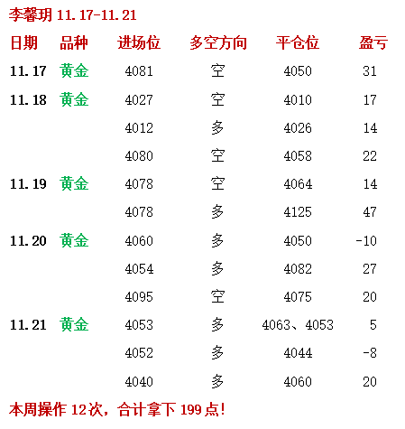 11.17 上周一,黄金白盘反弹弱势,不及策略做空预期,实盘中,直接公开安排了4081-83空单,午后顺利到4050目标止盈出局,收获30-33点利润,本周开门红!