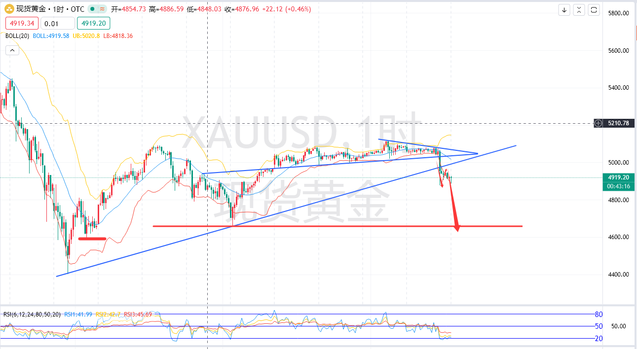 周四纽约尾盘,现货黄金跌3.26%,报4918.36美元/盎司,北京时间00:00之前维持微幅下跌状态,主要持稳于5050美元上方,随后出现一波急剧的跳水行情。参与上,尾盘二次参与反弹空;尾盘博文当中给出5075-90区域依托5000损继续空,短线目标20-30个点稳稳落袋。从日K级别来看,收线实体大阴柱;预示着5000关口之下调整有望 进一步延续信号。从大趋势长期来看,还是属于多头趋势结构当中,对于长期看涨朋友而言,下方可以关注4550不错接多也是偏稳健的位置,可以视作守强关键支撑关口对待!随着时间的推移布林下轨慢线逐步上移会与其形成共振。