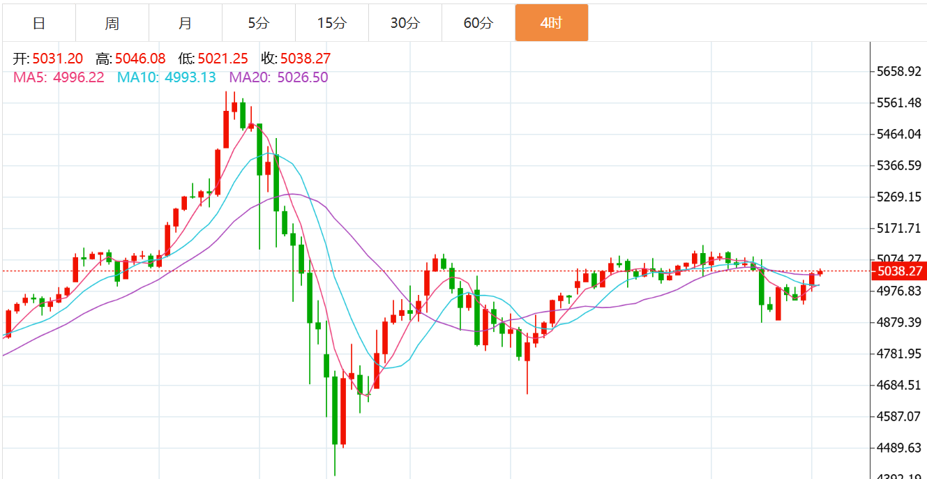 日线结构上来看,昨日大阴线贯穿跌破均线带,本周以来多头苦心坚守的均线带阵地失守,也就意味着行情结束反弹,或将重启中期级别的调整。日内上方先关注对均线带压力的测试,即4980-5000一带争夺,如果今日不能收回至此压之上,那么昨日大阴线的影响力或将会在下周得到彰显,即可能下周出现连续的下跌调整,甚至可能再回4700-4600区域。