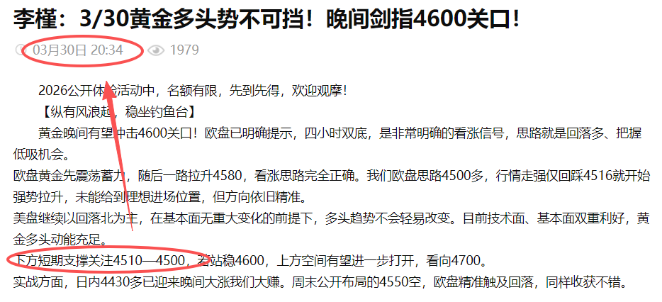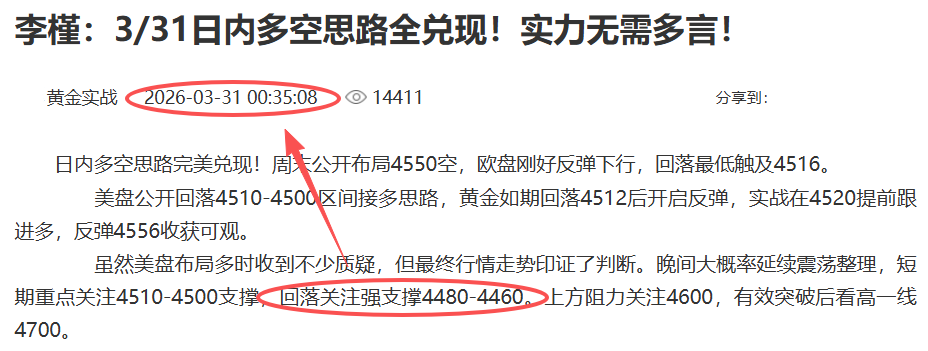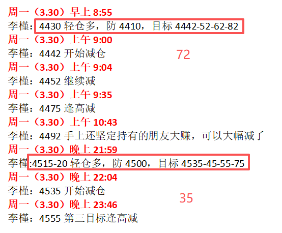 3月30日周一早盘先是4430多,晚间大涨触及4580。美盘公开4510多,黄金触及4512后上行,实战同步跟进,反弹4557也收获不错。凌晨提到的回落强支撑4480多,早盘触及又是精准符合预期。
