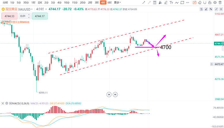 周四一整天,黄金从4700涨到4800,午夜的时候,黄金从4801附近又开始回落,现在收盘在4757左右。从目前的盘面能看出来,周五CPI数据公布之前,黄金又进入震荡模式了。技术面上,区间就在4800到4700之间,大概率不会突破这个区间。不过我得重点强调一下,4700这个点位很关键,既是日线周期布林中轨的支撑,也是H4周期布林中轨的支撑,不管是价格表现还是市场因素,支撑都很足,只要不跌破,上涨的可能性就很大。上方压力就是4800,还有本周的高点4860;但如果意外跌破4700,下方也可能会大跌一波,到4600的低点。