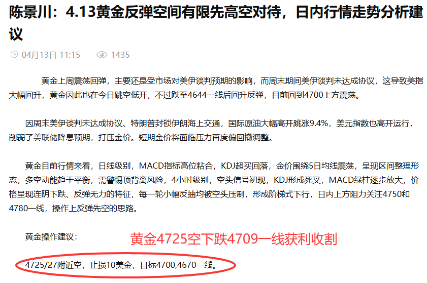 汇通网4月13日讯—— 陈景川:4.13黄金4725空,4738空全部获利兑现,晚间行情走势分析建议