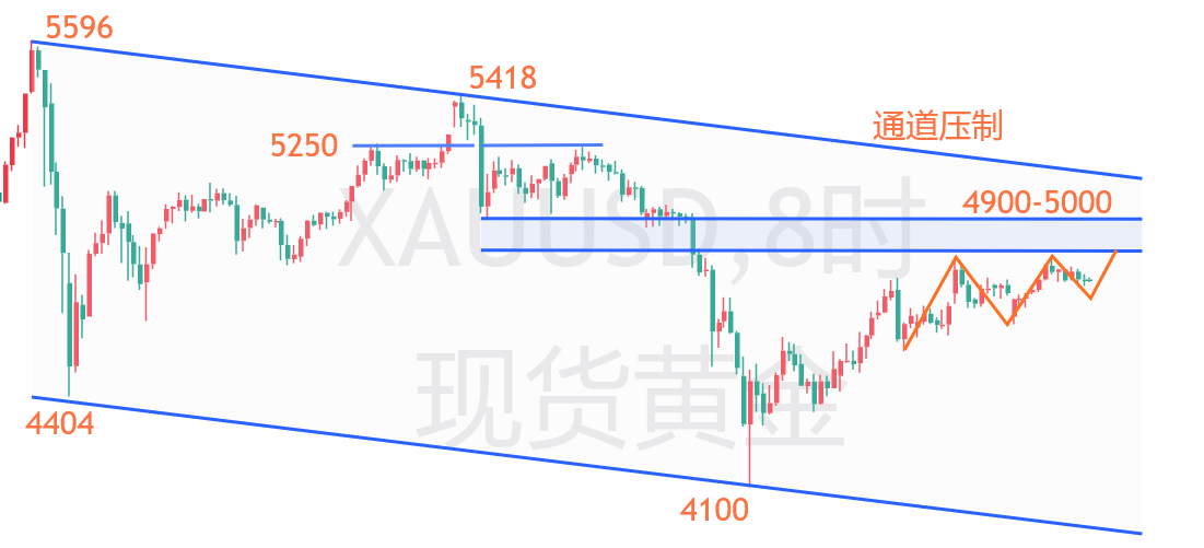 黄金,大趋势接早间分析所述,周内价格冲高4871后回落盘整,周四下探4773,日图连续收阴,K线组合未明显反转,整体思路仍看涨。待和谈落定后受美联储降息提振会测试4100-5418连线61.8%节点4910及通道压制攻防,中期暂缺乏重返高位动力。