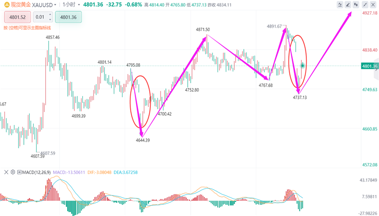 还有H4周期,区间表现更明显,上方压力在4860,下方支撑在4750。只要在这个H4的区间里,咱们就别瞎猜方向、只要区间不破,来回高抛低吸就完事了。总的来说,这周的行情就一个思路:区间不破就在区间里博弈,等小区间破了再看大区间的范围,等大区间破了,再跟着单边行情走就行。