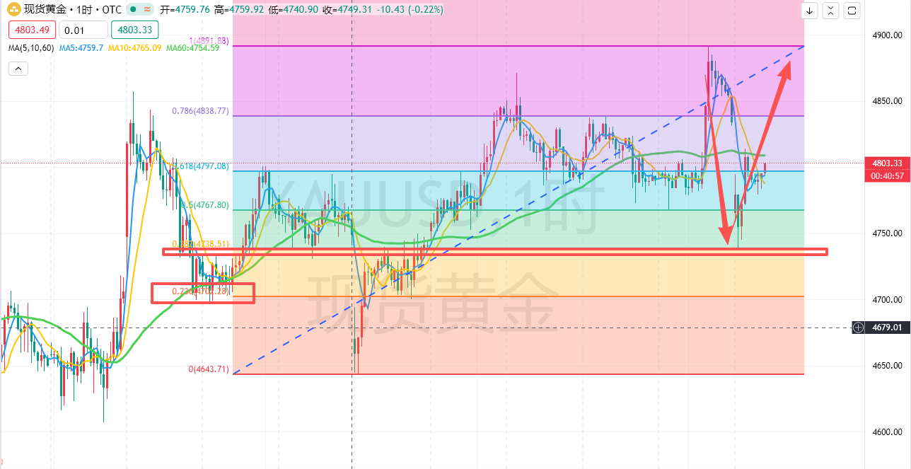 技术面上,短期整体趋势还是围绕震荡上行节奏看待,只不过是周末霍尔木兹海峡再度关闭引发了空头回调延续性,4900刚好对应日K级别MA60均线压制,此处压制密集,头寸高位套利,勿把回踩蓄势当做趋势反转对待,价格最低触及4737探低回升快速拉回4760上方,说明此处多头承接力还是相当强的,4737刚好对应小时4643-4890上行趋势斐波那契0.382位置,也是日内重点关注支撑关口,没有基本面利空再次的影响此处就是短期的铁底,跌破可能性不大,总体而言谨防买预期卖事实风险,不建议再去追空,回踩接多才是最优之选,看清短期趋势顺势而为才不会被行情来回扇。