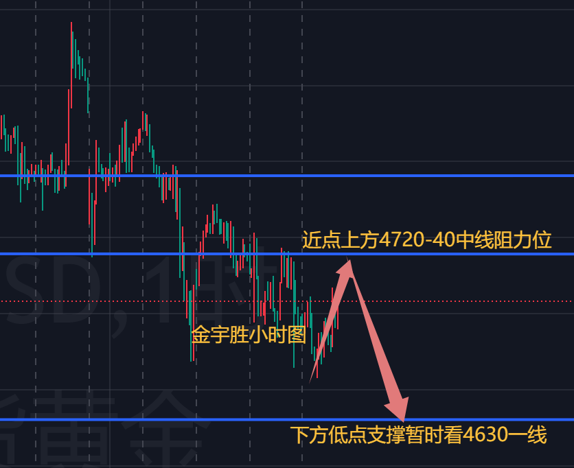 这是周一开盘给出的思路;上周末本人金宇胜一直给出的思路就是,局势短期内难有平和,而黄金现在对应局势的涨跌相对于几年前是完全相反的,局势越乱跌的越凶,上周好几天加上周末本人一直在给出下方的同一个重要位置,就是4740,这是上周的一个要中缺口位置,加上现阶段顶底的上下过大突破很难,所以短期内很容易走出回补的走势,4740这一线第一次到达后可以轻仓尝试一波抄底,